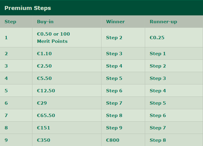 You can enter any Premium Steps Sit & Go by paying the relevant buy-in. Tournament Tickets won in Premium Steps can only be used to enter further Premium Steps with the corresponding buy-in amount and, if unused, expire two months after they are credited. Merit Points are not awarded as a result of entering a tournament using a Tournament Ticket.