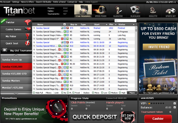 Titanbet have always been one for big welcome bonuses and new player freerolls. Visit direct and you'll be offered a match deposit bonus of £30 to get £60. We have negotiated an improved offer that will see you get a 200% match deposit bonus up to £1,200. For players who choose to deposit, there are 8 freeroll tickets worth $12,000 for all new players. Full details of the deposit bonusare under the Promotions tab (welcome package).